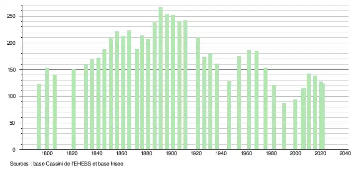 L'évolution du nombre d'habitants est connue à travers les recensements de la population effectués dans la commune depuis 1793. Pour les communes de moins de 10 000 habitants, une enquête de recensement portant sur toute la population est réalisée tous les cinq ans, les populations légales des années intermédiaires étant quant à elles estimées par interpolation ou extrapolation[58]. Pour la commune, le premier recensement exhaustif entrant dans le cadre du nouveau dispositif a été réalisé en 2005[59].