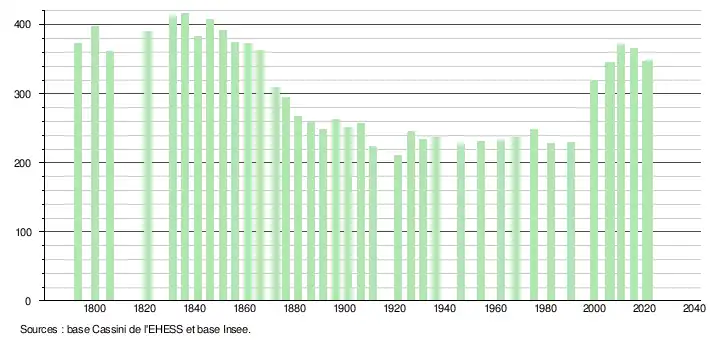 L'évolution du nombre d'habitants est connue à travers les recensements de la population effectués dans la commune depuis 1793. Pour les communes de moins de 10 000 habitants, une enquête de recensement portant sur toute la population est réalisée tous les cinq ans, les populations légales des années intermédiaires étant quant à elles estimées par interpolation ou extrapolation[18]. Pour la commune, le premier recensement exhaustif entrant dans le cadre du nouveau dispositif a été réalisé en 2005[19].