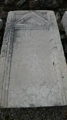 De nombreuses pièces sont identifiées comme faisant partie de tombeau de grande dimension par la taille des lettres, qui ne les destine qu'à ce type d'édifice. Ainsi sont caractéristiques de cette identification les épitaphes de C. Flauius Ianuarius[22] ou de M. Valerius Albanus et de son épouse[23] ; retrouvée comme pierre de remploi respectivement à Saint-Just et Saint-Laurent-de-Choulans[21].