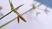 Chez les Cyperaceae, comme chez les Poaceae, l'inflorescence élémentaire est généralement un « épillet ». Celui-ci regroupe des fleurs très petites réduites à leurs pièces fertiles (anthères et carpelles), sans périanthe ou avec un périanthe réduit à des poils ou des écailles. Ces fleurs peuvent être bisexuées ou unisexuées (mâles ou femelles). Chaque fleur est sous-tendue et en partie cachée par une bractée en forme d'écaille, appelée « glume ». L'épillet est indéterminé (c'est-à-dire sans fleur terminale), sauf chez certains genres (Hypolytrum, Lepironia et Mapania) où il se termine par une fleur femelle apparemment terminale. On parle dans ce cas de « pseudo-épillet »[21]. Le nombre de fleurs par épillet est généralement faible, mais peut dépasser la centaine dans le Carex. Leur disposition sur l'axe de l'épillet (rachéole) peut être distique, tristique ou spiralée[22].