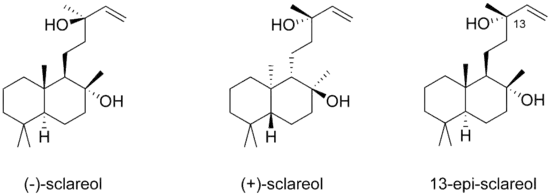Dans l'exemple ci-dessous, le (–)-sclaréol (à gauche) est l'épimère du 13-épi-sclaréol (à droite) car seule la configuration absolue du carbone asymétrique en position 13, selon la numérotation du produit naturel, est inversée par rapport au (–)-sclaréol.