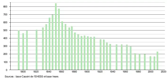 L'évolution du nombre d'habitants est connue à travers les recensements de la population effectués dans la commune depuis 1793. À partir du , les populations légales des communes sont publiées annuellement dans le cadre d'un recensement qui repose désormais sur une collecte d'information annuelle, concernant successivement tous les territoires communaux au cours d'une période de cinq ans. Pour les communes de moins de 10 000 habitants, une enquête de recensement portant sur toute la population est réalisée tous les cinq ans, les populations légales des années intermédiaires étant quant à elles estimées par interpolation ou extrapolation[6]. Pour la commune, le premier recensement exhaustif entrant dans le cadre du nouveau dispositif a été réalisé en 2005[7],[Note 2].