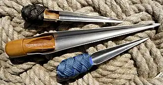 À l'origine pièce conique allongée, pointue, polie, de bois dur (buis) ou de métal (acier) de longueur variable, suivant l'usage et en fonction du diamètre du cordage à travailler.