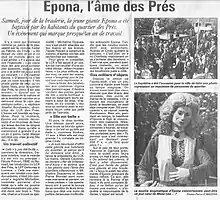 Cette géante de procession tient son nom d'une déesse majeure de la mythologie celto-gauloise: Épona[1], dont le culte est attesté en Gaule par des sources gallo-romaines. Le plus ancien renseignement sur cette déesse gauloise se trouve chez Juvénal « ...iurat/ solam Eponam et facies olida ad praesepia pictas »[2]. On y fait aussi allusion chez Minucius Félix : « Nisi quod vos et totos asinos in stabulis cum vestra vel Epona consecratis »[3].
