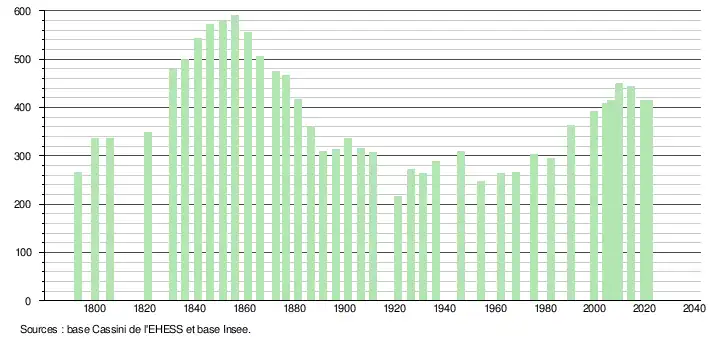 L'évolution du nombre d'habitants est connue à travers les recensements de la population effectués dans la commune depuis 1793. Pour les communes de moins de 10 000 habitants, une enquête de recensement portant sur toute la population est réalisée tous les cinq ans, les populations légales des années intermédiaires étant quant à elles estimées par interpolation ou extrapolation[17]. Pour la commune, le premier recensement exhaustif entrant dans le cadre du nouveau dispositif a été réalisé en 2004[18].