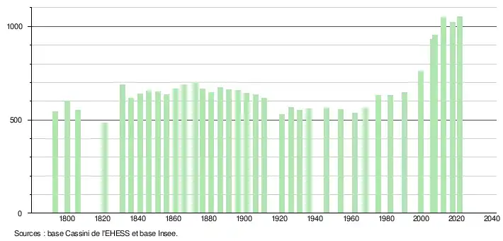 L'évolution du nombre d'habitants est connue à travers les recensements de la population effectués dans la commune depuis 1793. Pour les communes de moins de 10 000 habitants, une enquête de recensement portant sur toute la population est réalisée tous les cinq ans, les populations légales des années intermédiaires étant quant à elles estimées par interpolation ou extrapolation[19]. Pour la commune, le premier recensement exhaustif entrant dans le cadre du nouveau dispositif a été réalisé en 2007[20].