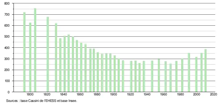L'évolution du nombre d'habitants est connue à travers les recensements de la population effectués dans la commune depuis 1793. À partir du , les populations légales des communes sont publiées annuellement dans le cadre d'un recensement qui repose désormais sur une collecte d'information annuelle, concernant successivement tous les territoires communaux au cours d'une période de cinq ans. Pour les communes de moins de 10 000 habitants, une enquête de recensement portant sur toute la population est réalisée tous les cinq ans, les populations légales des années intermédiaires étant quant à elles estimées par interpolation ou extrapolation[4]. Pour la commune, le premier recensement exhaustif entrant dans le cadre du nouveau dispositif a été réalisé en 2005[5],[Note 1].