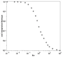 - s'appelle coefficient de transpiration thermique. Il varie de 0.5 en régime balistique (pas de collision entre particules) à 1 pour le régime continu (voir courbe). L'équation obtenue dans ce dernier cas est l'équation de Darcy avec une perméabilité où est la viscosité dynamique.