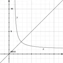 Ainsi, la ligne et la courbe se croisent lorsque x = y = e.