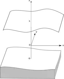 On désigne par s(x,y) l'altitude de la surface par rapport au géoïde, par b(x,y) la surface solide, par H = s - b la hauteur de fluide et g la pesanteur comptée négativement vers le bas.
