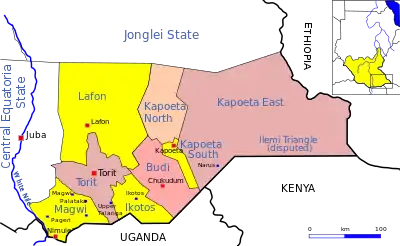 Les autres villes importantes sont : Kapoeta, Magwi, Ikotos, Nimule, Pageri, Owiny Kibul, Parjok, Khiala, Narus, Lapon, Chukudum et Polataka.