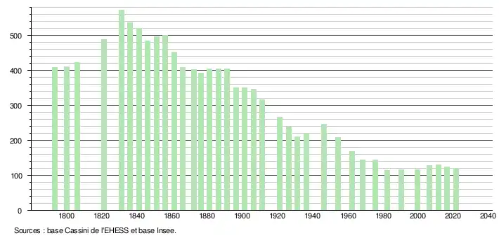 L'évolution du nombre d'habitants est connue à travers les recensements de la population effectués dans la commune depuis 1793. Pour les communes de moins de 10 000 habitants, une enquête de recensement portant sur toute la population est réalisée tous les cinq ans, les populations légales des années intermédiaires étant quant à elles estimées par interpolation ou extrapolation[19]. Pour la commune, le premier recensement exhaustif entrant dans le cadre du nouveau dispositif a été réalisé en 2006[20].
