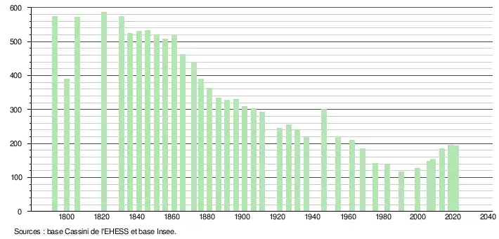 L'évolution du nombre d'habitants est connue à travers les recensements de la population effectués dans la commune depuis 1793. Pour les communes de moins de 10 000 habitants, une enquête de recensement portant sur toute la population est réalisée tous les cinq ans, les populations légales des années intermédiaires étant quant à elles estimées par interpolation ou extrapolation[19]. Pour la commune, le premier recensement exhaustif entrant dans le cadre du nouveau dispositif a été réalisé en 2008[20].