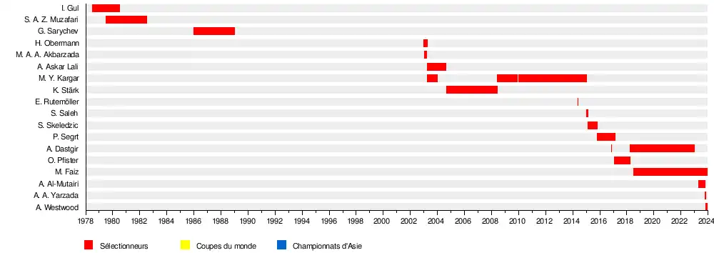 Le tableau suivant représente la liste des sélectionneurs de l'équipe d'Afghanistan depuis 1978.
