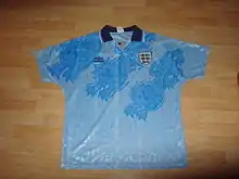 L'Angleterre a également parfois eu recours à un troisième maillot. Lors de la coupe du monde 1970, l'Angleterre utilise une troisième tenue avec des maillots, des shorts et des bas bleu clair[63] contre la Tchécoslovaquie. En 1973, l'équipe utilise une tenue similaire à celle du Brésil, avec un maillot jaune et un short bleu[64], qui est portée contre la Tchécoslovaquie, la Pologne et l'Italie. Entre 1986 et 1992 l'Angleterre utilise plusieurs tenues[65],[66],[67],[68] au maillot bleu pâle, rarement portées en match.