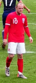Les couleurs de la tenue extérieure de l'équipe d'Angleterre sont constituées de maillots rouges, de shorts blancs et de bas rouges, cette tenue extérieure n'a pas été nécessaire avant que l'équipe d'Angleterre ne rencontre des équipes en dehors du Royaume-Uni. De 1945 à 1952, l'Angleterre porte une tenue extérieure entièrement bleue. En 1996, le maillot extérieur de l'Angleterre est changé pour une tenue comprenant des maillots, des shorts et des bas gris[62]. Cette tenue est portée contre la Bulgarie, l'Allemagne et la Géorgie mais l'abandon du traditionnel rouge se révèle impopulaire parmi les supporters et depuis lors la tenue extérieure est restée rouge. Cette tenue extérieure est parfois utilisée pour les matchs à domicile.