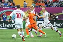 Le 2 septembre, les Oranjes battent le record de buts de l'équipe en inscrivant onze buts à l'Amsterdam Arena face à Saint-Marin[108]. Quatre jours plus tard, ils s'imposent en Finlande et obtiennent officiellement leur qualification pour la phase finale de l'Euro. Après une nouvelle victoire sur la Moldavie (1-0), les Oranjes perdent leur unique rencontre des éliminatoires en Suède (2-3)[109]. Au mois de novembre 2011, ils encaissent une lourde défaite lors d'un match amical face à l'Allemagne (0-3). Commencent alors les matchs de préparation à l'Euro, les Pays-Bas l'emportent le 29 février en Angleterre (3-2) avant d'encaisser deux revers successivement le 22 mai face au Bayern Munich (2-3), puis à domicile le 26 mai face à la Bulgarie (1-2), qui montrent les faiblesses de la défense néerlandaise[110]. Cependant, ils se reprennent le 29 mai face à la Slovaquie (2-0) puis le 1er juin en écrasant l'Irlande du Nord (6-0).