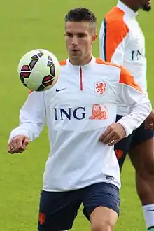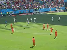 Pendant la Coupe du monde, Van Gaal passe au 5-3-2 et opte pour une tactique basée sur les contre-attaques à cause de la blessure de Kevin Strootman qu'il jugeait indispensable au bon fonctionnement de l'équipe dans le 4-3-3[123]. Tirés dans le groupe B où ils affrontent l'Australie, le Chili mais surtout l'Espagne, les Néerlandais terminent premier du groupe avec trois victoires[124], en humiliant au passage les Espagnols (5-1). Les Oranjes affrontent alors le Mexique en huitième de finale et se qualifient avec difficulté en marquant deux buts dans les toutes dernières minutes du match dont un penalty « généreux » (2-1). S'ensuivent les quarts de finale où ils affrontent le Costa Rica, grande surprise du mondial, qui les mène jusqu'aux tirs au but conclus par une victoire néerlandaise (0-0, t.a.b. 4-3). Les médias saluent l'audace de Van Gaal qui a fait entrer Tim Krul à la fin de la prolongation, choix qui s'avère payant car il a arrêté deux tirs costariciens[125],[126]. Cependant, ce beau parcours s'arrête en demi-finale puisque les Néerlandais perdent face à l'Argentine (0-0, t.a.b. 3-4). Lors du match de la troisième place, critiqué par Van Gaal et Robben pour son inutilité[127], ils écrasent le Brésil (3-0), pays organisateur et légende du football. Van Gaal démissionne par la suite, ayant auparavant signé dans le club anglais de Manchester United[128].