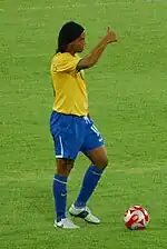 Après les « 3 R » de 2002, le Brésil s'appuie pour la Coupe du monde 2006 sur un « quatuor magique » Ronaldinho-Kaká-Ronaldo-Adriano[99]. Usé par une saison très chargée, Ronaldinho est loin de sa meilleure forme. Pourtant la Seleção s'impose dans son groupe avec facilité, grâce à trois victoires en trois matchs. Qualifiée en huitième de finale, elle écarte sans surprise le Ghana (3-0) et doit affronter en quart la France, portée par un Zinédine Zidane au sommet de son art. Le Brésil offre un spectacle de piètre qualité avec la mise en place d'un jeu défensif. Les Français, solides, l'emportent logiquement, grâce à un but de Thierry Henry qui profite du mauvais placement défensif sur un coup franc de Zidane[100]. Cette défaite attise de nombreuses critiques et de grandes déceptions.