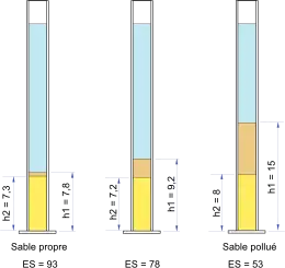 L’essai consiste à verser un échantillon de sable et une petite quantité de solution floculante dans une éprouvette graduée et d’agiter de façon à détacher les revêtements argileux des particules de sable de l’échantillon. On complète alors le sable en utilisant le reste de solution floculante afin de faire remonter les particules fines en suspension au-dessus du sable. Après 20 min, les hauteurs des produits sont mesurées. L’équivalent de sable est le rapport hauteur du sable sur hauteur totale, exprimé en pourcentage[3].