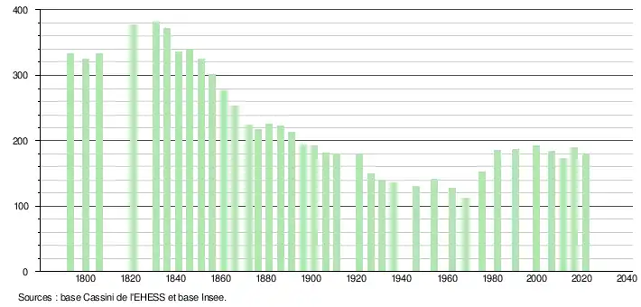 L'évolution du nombre d'habitants est connue à travers les recensements de la population effectués dans la commune depuis 1793. Pour les communes de moins de 10 000 habitants, une enquête de recensement portant sur toute la population est réalisée tous les cinq ans, les populations légales des années intermédiaires étant quant à elles estimées par interpolation ou extrapolation[16]. Pour la commune, le premier recensement exhaustif entrant dans le cadre du nouveau dispositif a été réalisé en 2006[17].