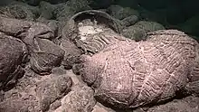 A faible profondeur, dans le second cas, des explosions phréatiques peuvent engendrer d'énormes coulées pyroclastiques[3]. Les éléments de laves trempés[alpha 1] au contact de l'eau de mer forment les hyaloclastites (souvent en coulées bréchiques[5]). Leur nature vitreuse est bien observable par les textures perlitiques[6].
