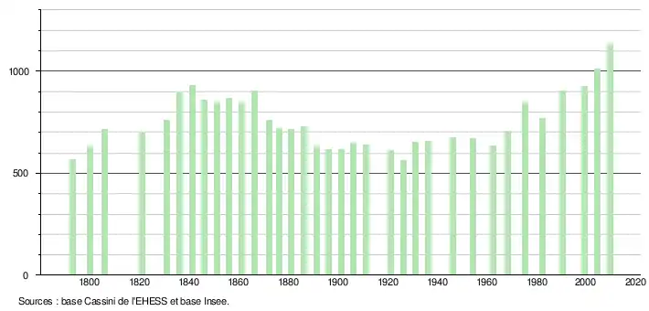 L'évolution du nombre d'habitants est connue à travers les recensements de la population effectués dans la commune depuis 1793. À partir du , les populations légales des communes sont publiées annuellement dans le cadre d'un recensement qui repose désormais sur une collecte d'information annuelle, concernant successivement tous les territoires communaux au cours d'une période de cinq ans. Pour les communes de moins de 10 000 habitants, une enquête de recensement portant sur toute la population est réalisée tous les cinq ans, les populations légales des années intermédiaires étant quant à elles estimées par interpolation ou extrapolation[4]. Pour la commune, le premier recensement exhaustif entrant dans le cadre du nouveau dispositif a été réalisé en 2004[5],[Note 1].