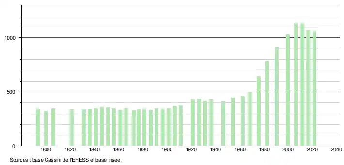 L'évolution du nombre d'habitants est connue à travers les recensements de la population effectués dans la commune depuis 1793. Pour les communes de moins de 10 000 habitants, une enquête de recensement portant sur toute la population est réalisée tous les cinq ans, les populations légales des années intermédiaires étant quant à elles estimées par interpolation ou extrapolation[20]. Pour la commune, le premier recensement exhaustif entrant dans le cadre du nouveau dispositif a été réalisé en 2006[21].