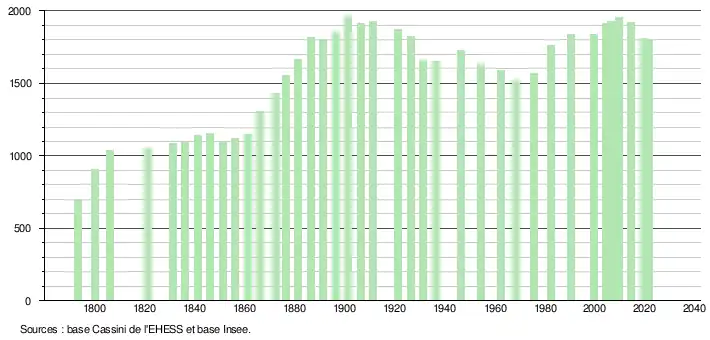 L'évolution du nombre d'habitants est connue à travers les recensements de la population effectués dans la commune depuis 1793. Pour les communes de moins de 10 000 habitants, une enquête de recensement portant sur toute la population est réalisée tous les cinq ans, les populations légales des années intermédiaires étant quant à elles estimées par interpolation ou extrapolation[18]. Pour la commune, le premier recensement exhaustif entrant dans le cadre du nouveau dispositif a été réalisé en 2004[19].