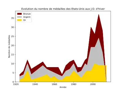 Évolution du nombre de médailles remportées par les États-Unis aux Jeux Olympiques d'hiver de 1924 à 2014.