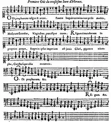 - Deux ou trois pièces antiques mises en musique sont publiées dans l’Harmonie universelle de Marin Mersenne (1636) : l'ode à deux voix Odi prophanum vulgus et arceo extraite du IIIe livre des Odes d'Horace (à la page 395 du Livre VIe de l'Embellissement des Chants), l'ode à une voix en grec ΑΡΙΣΤΟΝ... de Pindare (à la p. 418 du même livre), peut-être aussi l'ode à deux voix Solvitur acris hyems grata d’Horace à la même page. Les deux premières pièces sont republiées dans Masson 1906.