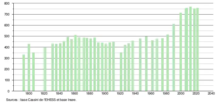 L'évolution du nombre d'habitants est connue à travers les recensements de la population effectués dans la commune depuis 1793. Pour les communes de moins de 10 000 habitants, une enquête de recensement portant sur toute la population est réalisée tous les cinq ans, les populations légales des années intermédiaires étant quant à elles estimées par interpolation ou extrapolation[26]. Pour la commune, le premier recensement exhaustif entrant dans le cadre du nouveau dispositif a été réalisé en 2007[27].