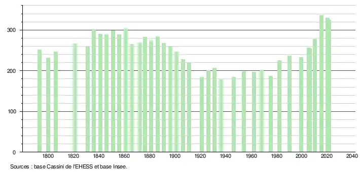 L'évolution du nombre d'habitants est connue à travers les recensements de la population effectués dans la commune depuis 1793. Pour les communes de moins de 10 000 habitants, une enquête de recensement portant sur toute la population est réalisée tous les cinq ans, les populations légales des années intermédiaires étant quant à elles estimées par interpolation ou extrapolation[26]. Pour la commune, le premier recensement exhaustif entrant dans le cadre du nouveau dispositif a été réalisé en 2005[27].