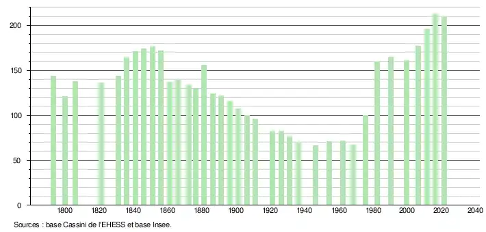 L'évolution du nombre d'habitants est connue à travers les recensements de la population effectués dans la commune depuis 1793. Pour les communes de moins de 10 000 habitants, une enquête de recensement portant sur toute la population est réalisée tous les cinq ans, les populations légales des années intermédiaires étant quant à elles estimées par interpolation ou extrapolation[17]. Pour la commune, le premier recensement exhaustif entrant dans le cadre du nouveau dispositif a été réalisé en 2006[18].