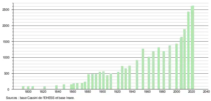 L'évolution du nombre d'habitants est connue à travers les recensements de la population effectués dans la commune depuis 1793. Pour les communes de moins de 10 000 habitants, une enquête de recensement portant sur toute la population est réalisée tous les cinq ans, les populations légales des années intermédiaires étant quant à elles estimées par interpolation ou extrapolation[21]. Pour la commune, le premier recensement exhaustif entrant dans le cadre du nouveau dispositif a été réalisé en 2005[22].