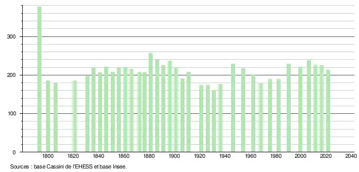 L'évolution du nombre d'habitants est connue à travers les recensements de la population effectués dans la commune depuis 1793. Pour les communes de moins de 10 000 habitants, une enquête de recensement portant sur toute la population est réalisée tous les cinq ans, les populations légales des années intermédiaires étant quant à elles estimées par interpolation ou extrapolation[15]. Pour la commune, le premier recensement exhaustif entrant dans le cadre du nouveau dispositif a été réalisé en 2006[16].
