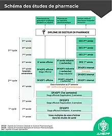 Les études durent de six à neuf ans selon les filières, et permettent l’obtention du « diplôme d’État de docteur en pharmacie » à l'issue de la soutenance d'une thèse d'exercice.