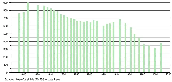 - Dans le tableau des recensements et le graphique, par convention dans Wikipédia, le principe a été retenu, pour les populations légales postérieures à 1999 de n’afficher dans le tableau des recensements et le graphique que les populations correspondant à l'année 2006, première population légale publiée calculée conformément aux concepts définis dans le décret no 2003-485 du 5 juin 2003, et les années correspondant à une enquête exhaustive de recensement pour les communes de moins de 10 000 habitants, ainsi que la dernière population légale publiée par l’Insee.