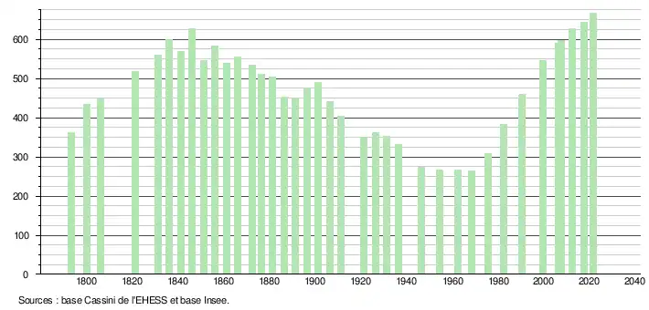 L'évolution du nombre d'habitants est connue à travers les recensements de la population effectués dans la commune depuis 1793. Pour les communes de moins de 10 000 habitants, une enquête de recensement portant sur toute la population est réalisée tous les cinq ans, les populations légales des années intermédiaires étant quant à elles estimées par interpolation ou extrapolation[14]. Pour la commune, le premier recensement exhaustif entrant dans le cadre du nouveau dispositif a été réalisé en 2007[15].