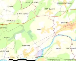 Évans est une commune sur l’axe Rhin-Rhône, traversée par de nombreuses voies de communication : l’Autoroute A36, la voie ferrée Besançon-Dole, la Route départementale 673, le canal Freycinet du Rhône au Rhin,et s’étend sur un territoire d’environ 1 100 hectares.