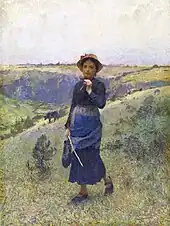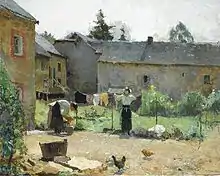 - «... Quelle différence avec l'atmosphère si délicatement nuancée baignant la cour de ferme où se situe la jeune femme aux allures sculpturales que n'aurait pas désavouée un Constantin Meunier. C'est une toile de "plein air". Désormais, c'est en plein air qu'Evariste Carpentier préfèrera peindre et avec une prédilection pour les sujets rustiques dont plusieurs artistes venaient de révéler la poésie. Carpentier a reconnu lui-même avoir particulièrement éprouvé à ce sujet l'influence de Bastien-Lepage, un peintre lorrain, auteur des "Foins" ; mais cette influence n'a-telle pas consisté surtout à raviver en lui le souvenir de sa jeunesse paysanne ? » - Michel Carpentier (fils aîné de l'artiste). Sources : Jacques Goijen, Dictionnaire des peintres de l'École Liégeoise du Paysage. Éditions, 2009