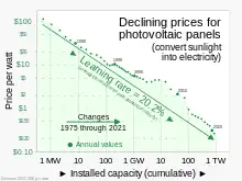 Lors de ses débuts, le développement était limité au Japon et aux pays européens. Cependant, les améliorations techniques et les économies d'échelles réalisées par la suite ont permis de réduire les coûts de cette technologie, notamment à la suite du développement de la production des capteurs solaires en Chine. Depuis, l'énergie solaire photovoltaïque se répand rapidement à l'échelle mondiale, elle a notamment atteint la parité réseau dans une trentaine de pays[3].