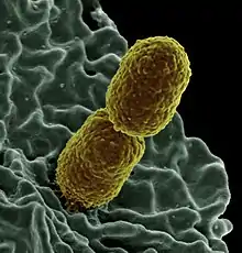 Les bactéries évoluent grâce à un processus similaire à celui des autres organismes, à savoir la sélection naturelle, par laquelle des adaptations bénéfiques sont transmises aux générations futures jusqu'à ce que le caractère nouveau devienne commun au sein de l'ensemble de la population[10]. Cependant, comme les bactéries se reproduisent par fission binaire, forme de multiplication asexuée, la cellule fille et la cellule mère sont génétiquement identiques. Ce fait rend les bactéries sensibles aux pressions environnementales, un problème qui peut être surmonté par le partage d'informations génétiques par transduction, transformation ou conjugaison. De nouvelles adaptations génétiques et physiques apparaissent donc, leur permettant de s'adapter à leur environnement et d'évoluer. De plus, les bactéries peuvent se reproduire en un temps très court de 20 minutes[11], permettant une adaptation rapide, et impliquant que de nouvelles souches de bactéries peuvent évoluer rapidement. Ce phénomène est un problème récurrent car les bactéries deviennent [[Résistance aux antibiotiques|résistantes aux antibiotiques[réf. nécessaire]]].