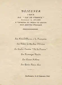 Menu du déjeuner servi à l'occasion du retour de l'Île-de-France sous pavillon français.