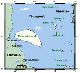 L'île Akimiski est une île de la Baie James au Canada. Elle appartient au territoire du Nunavut et n'est pas habitée. Elle a une superficie de 3 000 km2. Sa partie ouest se trouve à seulement 19 km de l'Ontario et sa partie orientale est un sanctuaire pour les oiseaux migrateurs, le refuge d'oiseaux de l'Île Akimiski, des ressources alimentaires importantes s'y trouvant[1].