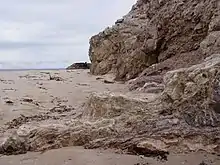Les 15 % restants sont composés de dépôts du Quaternaire, principalement situés dans le secteur des Sillons, dans le sud-ouest de l'île[3]. Ces sables et graviers sont créés par l'érosion des falaises de grès par les vagues et sont ensuite transportés par les courants marins vers les plages[3]. On retrouve aussi dans ce secteur des dunes et des tourbières formées par le déplacement de dépôts éoliens[3].