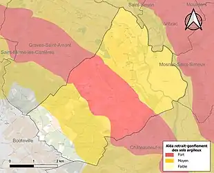 Le retrait-gonflement des sols argileux est susceptible d'engendrer des dommages importants aux bâtiments en cas d’alternance de périodes de sécheresse et de pluie. 90,3 % de la superficie communale est en aléa moyen ou fort (67,4 % au niveau départemental et 48,5 % au niveau national). Sur les 198 bâtiments dénombrés sur la commune en 2019, 192 sont en aléa moyen ou fort, soit 97 %, à comparer aux 81 % au niveau départemental et 54 % au niveau national. Une cartographie de l'exposition du territoire national au retrait gonflement des sols argileux est disponible sur le site du BRGM[23],[Carte 3].