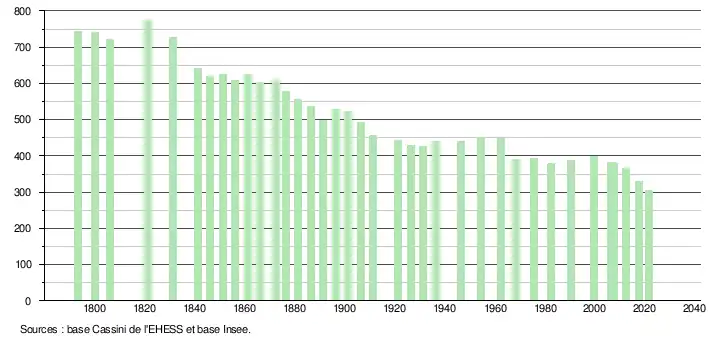 - Population municipale légale en vigueur au 1er janvier 2024, millésimée 2021, définie dans les limites territoriales en vigueur au 1er janvier 2023, date de référence statistique : 1er janvier 2021.