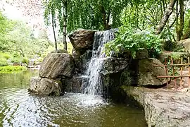 Le paysage recréé et structuré par des rocailles, cascades et pièces d'eau est richement planté de végétaux exotiques tels que bambous, cyprès chauves, rhododendrons, camélias et cerisiers du Japon.