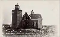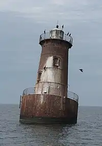 | Sharp Island | 38° 38′ 21″ N, 76° 22′ 33″ O | États-Unis, baie de Chesapeake, Maryland | Un des dizaines (voire centaines) d'îlots engloutis de la baie. Un cordonnier de Baltimore y avait fait bâtir à la fin du XIXe siècle un hôtel de style victorien de trois étages, flanqué d'une promenade et d'un quai. Il fut détruit dans les premières années du XXe siècle. L'île avait disparu en 1963[50]. Un phare y subsista de 1838 à 1848, puis fut rebâti plus loin en 1882 (illustration). | E+C | ![]() |
